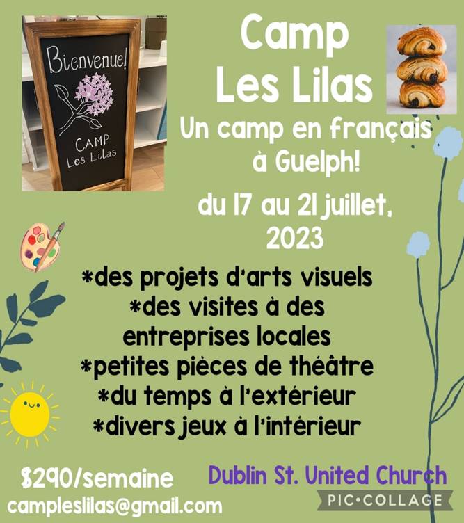Nous sommes très heureuses d’accueillir nos campeurs pour une deuxième année du Camp Les Lilas ! Nous sommes 2 enseignantes en immersion française ayant une passion pour la langue française et pour les enfants ! Notre camp, qui accueille les jeunes de 6 à 12 ans, aura lieu à Dublin St. United Church à Guelph. Pendant la semaine du 17 au 21 juillet, de 9h00 à 16h00, les campeurs pratiqueront leur français en complétant des projets d’arts visuels et des activités d’art dramatique.
